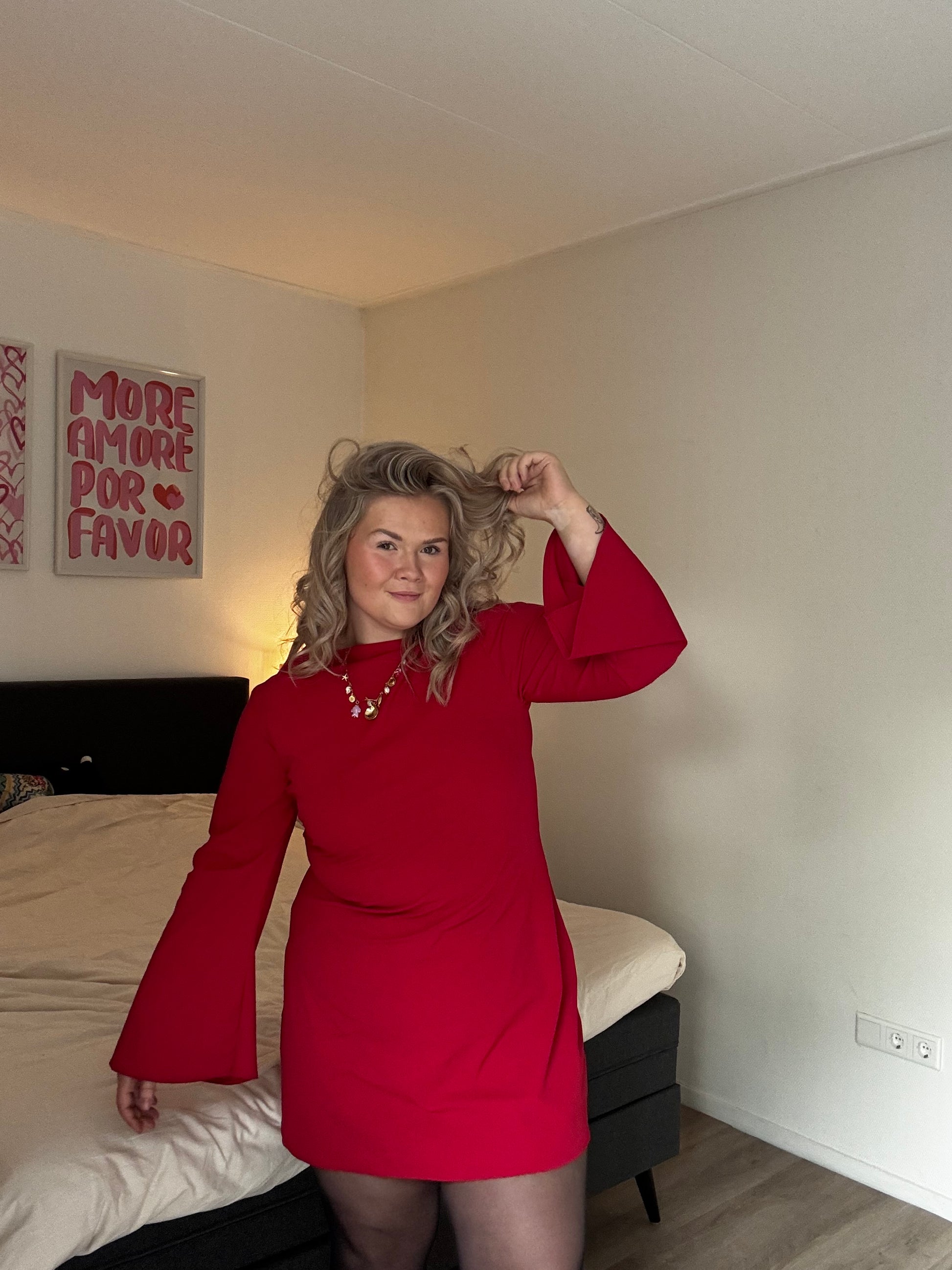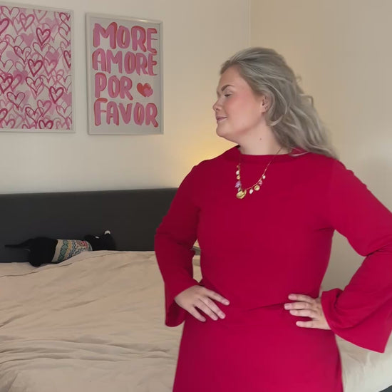 Maak kennis met Lola – jouw nieuwe zomerfavoriet. Deze dieprode mini dress is alles wat je zoekt in een jurk: vrouwelijk, comfortabel én uniek. De flared mouwen geven een speelse swing, terwijl de hoge, aansluitende hals zorgt voor een chique, moderne uitstraling. Lola valt halverwege de bovenbenen en is gemaakt van een stevige, stretchy stof die mooi in vorm blijft én heerlijk zit. Perfect voor warme dagen waarop je stijlvol én comfortabel voor de dag wilt komen. Of je haar nu styled met sandalen voor een brunch of met hakken voor een zwoele zomeravond — Lola laat je stralen.